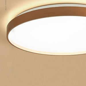 A round metal flush‑mount ceiling light finished in a refined white with subtle grey and gold accents. The compact form sits close to the ceiling, making it suitable for low ceilings and contemporary interiors. It is dimmable and offers three selectable colour temperatures, with an integrated LED light source.