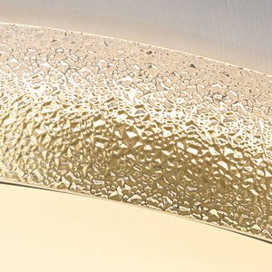 The fixture presents a smooth, circular form with clean lines and a layered visual texture created by the colour and line divisions. The combination of copper‑rich metal and frosted glass contributes a sophisticated, noble look. The round shade distributes light evenly, while the gold tone adds a touch of understated luxury to the ceiling.