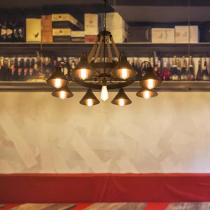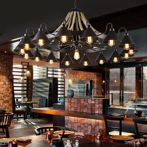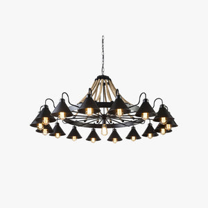 The Epoch Vintage Industrial Chandelier introduces a commanding, architectural focal point to interiors. Finished in a matte black metal, its design balances rugged industrial appeal with refined detailing. Nine or seventeen cone-shaped lights hang from textured rope cords, creating a layered silhouette that adds depth and character to ceilings in living rooms or bedrooms.
