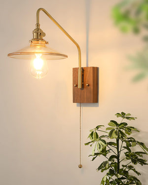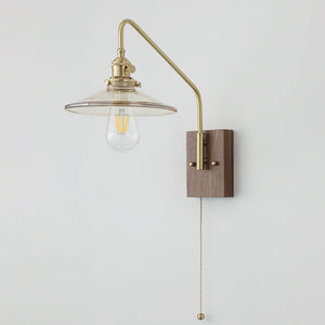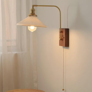 Brass Wall Lamp With Walnut Base And Pleated White Glass Shade