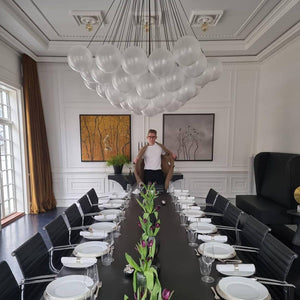 Electrical and installation notes: this fitting is for indoor, hardwired use and is IP20 rated. Bulbs are not included. It accepts LED or Edison-style bulbs with an E26/E27 base and operates on a standard 110–240V supply. The suspension rod is 50 cm (19.7") long, and can be adjusted upon request to suit ceiling height and ceiling-to-table distance. For safety and optimal performance, professional installation is recommended.