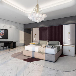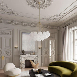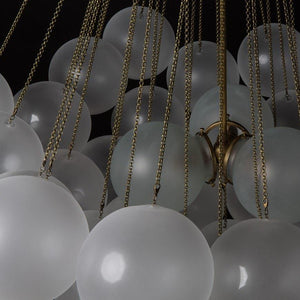 Structure and materials: the fixture combines a sturdy metal frame with glass shade elements. The round glass orbs form a dramatic yet understated silhouette, designed to complement contemporary and classic interiors alike.