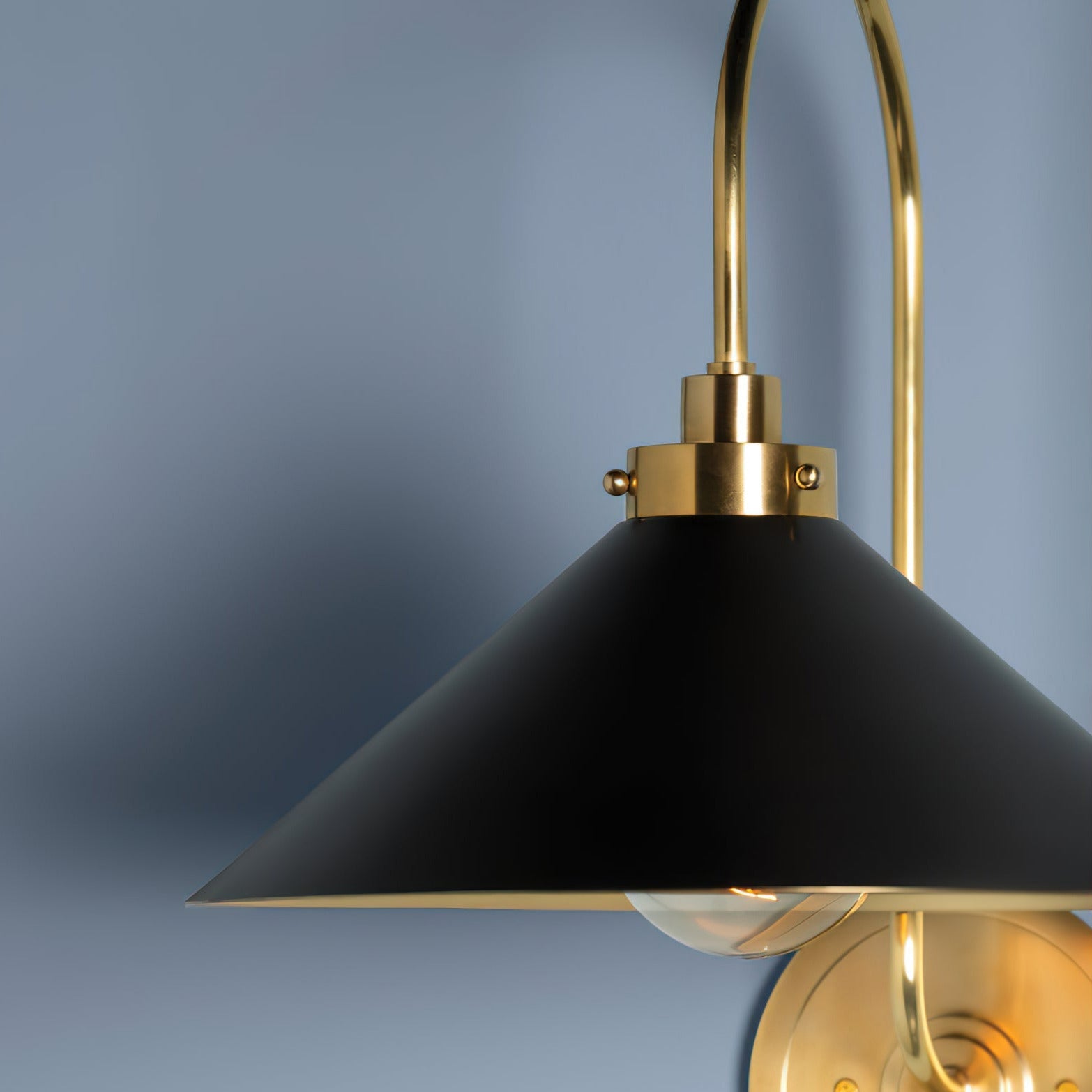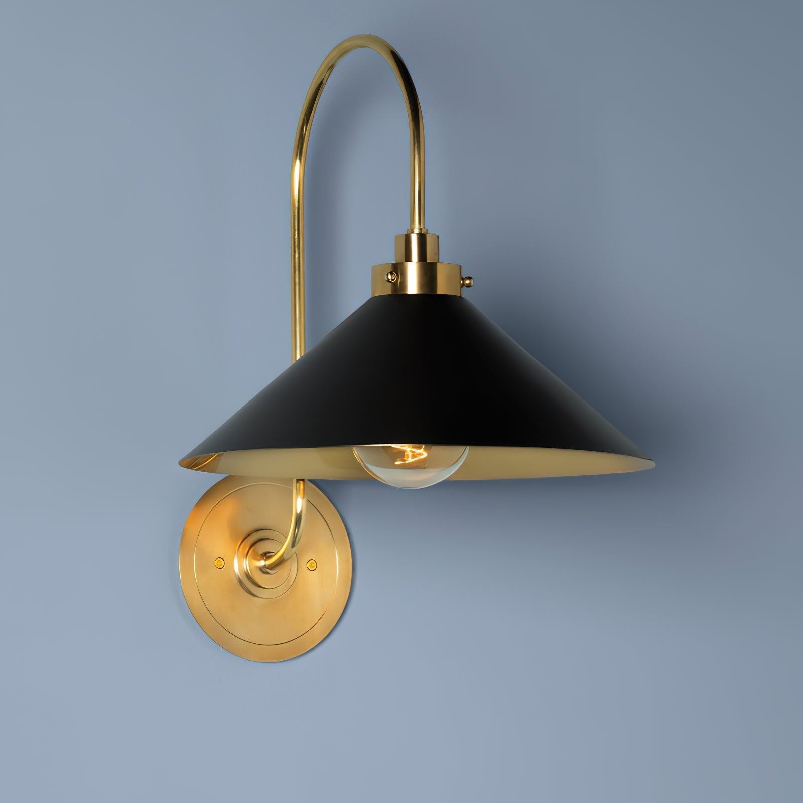 The Helena Vintage Brass Wall Light blends a slender curved arm with a conical metal shade, finished in warm brass with subtle gold-toned detailing. This refined silhouette adds a modern vintage touch to contemporary interiors while delivering a practical, reliable lighting solution.