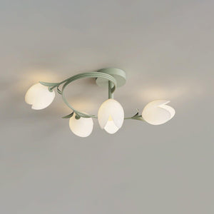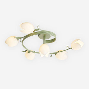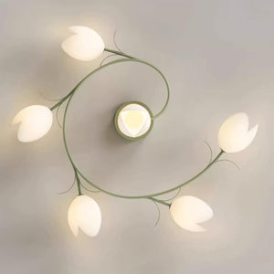 Designed with a circular central hub and radiating arms, the six heads form an understated focal point on the ceiling. The tulip-inspired heads provide soft, directional light while maintaining a sculptural profile. The minimal metal frame keeps the look contemporary and adaptable to a range of interior schemes, from light and airy to more restrained contemporary palettes.