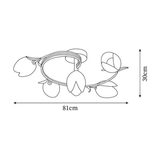 Three head configurations are available to suit different room sizes: 4-head with a diameter of 73.5 cm (29") and a height of 30 cm (11.8"); 5-head with a diameter of 81 cm (31.9") and a height of 30 cm (11.8"); and 6-head with a diameter of 94.5 cm (37.2") and a height of 30 cm (11.8"). All versions have a consistent height profile of 30 cm (11.8 cm). The light is hardwired to the ceiling and uses an E26 or E27 screw socket. It accommodates one 5W incandescent bulb or LED equivalent and is compatible with dimmer switches (not included).
