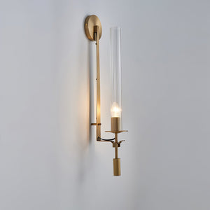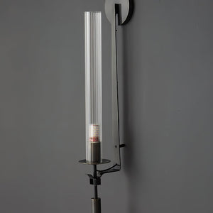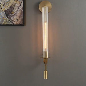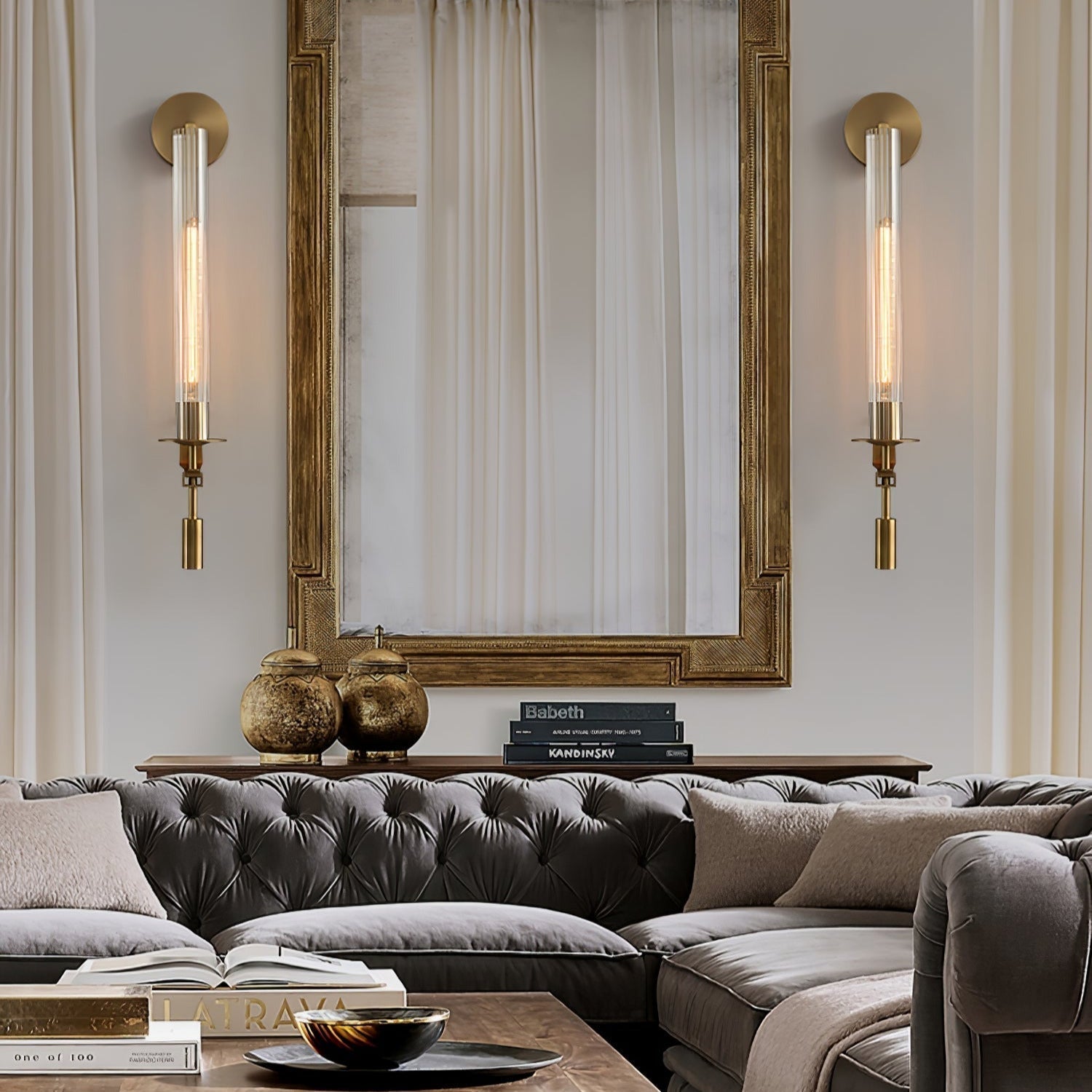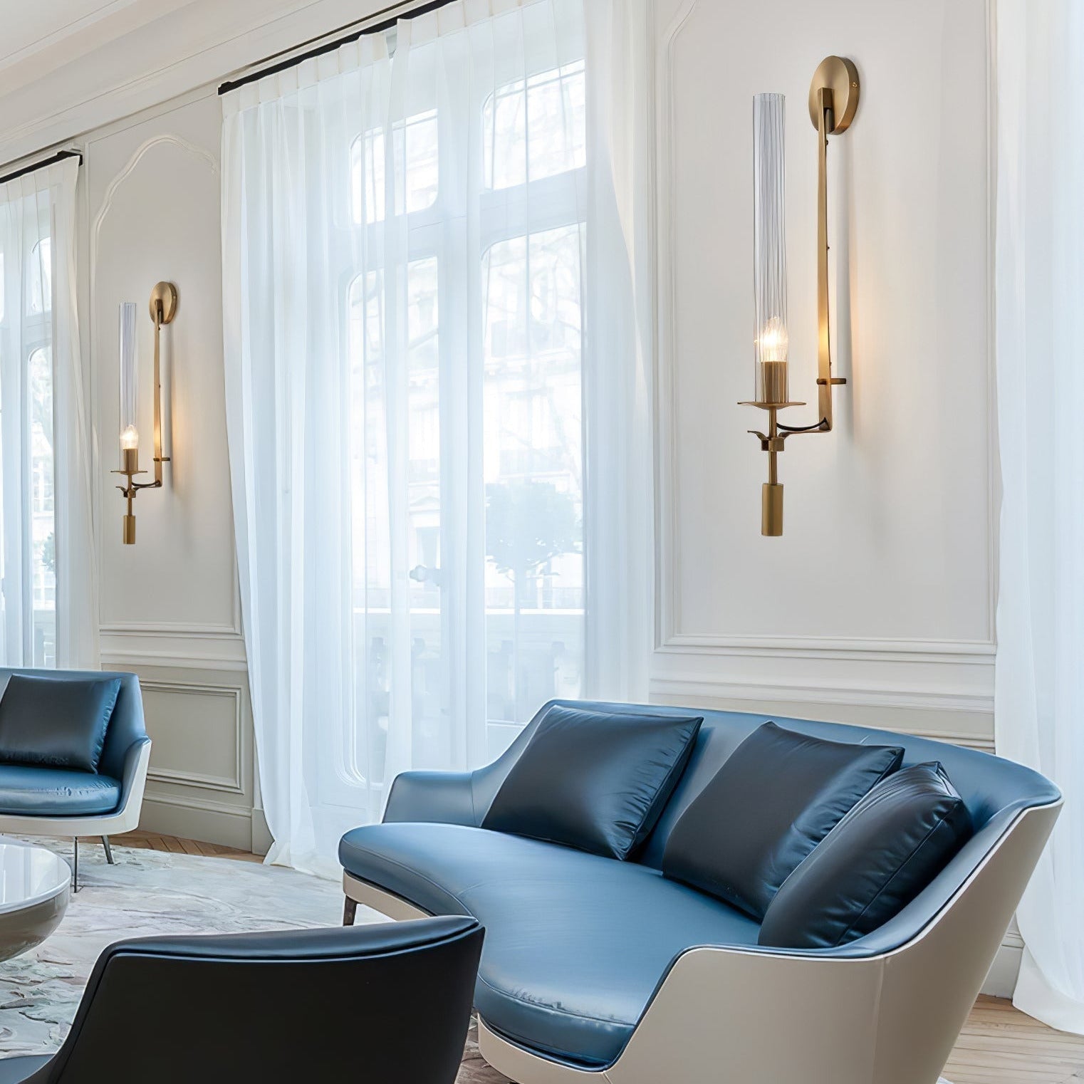 Immerse your space in 1940s-inspired French elegance with this indoor wall lamp, crafted in solid brass and crowned by ribbed glass cylinders that cradle an Edison-style bulb. The result is a warm, candle-like glow against a clean, minimalist silhouette that suits both contemporary and classic interiors.
