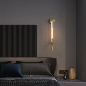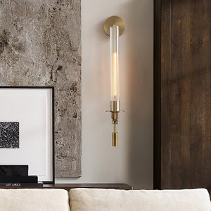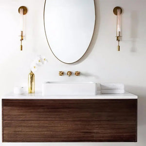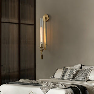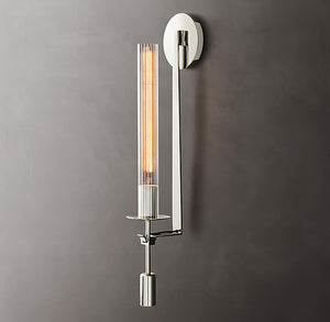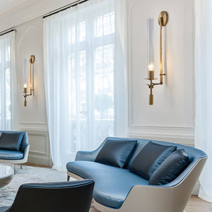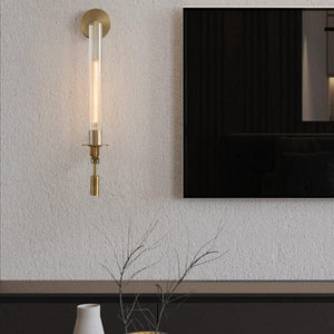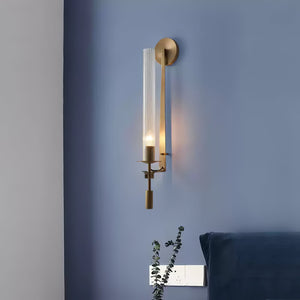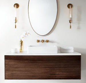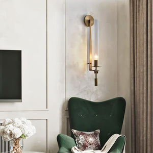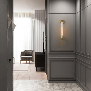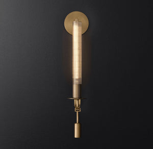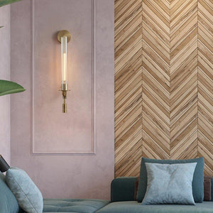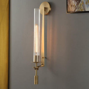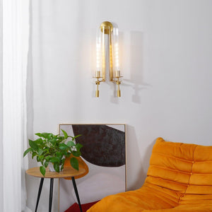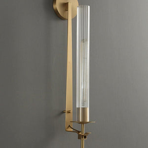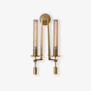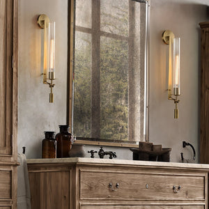 This solid brass wall lamp captures a touch of 1940s French elegance, combining a sturdy brass body with ribbed glass cylinders that cradle an Edison-style bulb. The result is a warm, candlelit glow that enhances a minimalist, farmhouse-inspired interior without overwhelm. Designed for indoor use, this wall light is a versatile choice for bedrooms, hallways or bathrooms where ambient, mood lighting is desired. Its refined silhouette makes it a subtle accent piece that complements a range of décor—from classic to contemporary. Key features