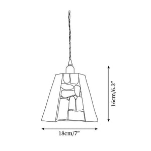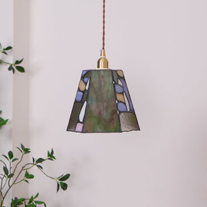 The shade is a glass composition that showcases the beauty of stained glass artistry, paired with brass hardware for a timeless, warm metallic gleam. The design embraces artisanal detailing while remaining versatile enough for both contemporary and traditional settings. Please note: the holes incorporated into the glass shade are intentional design elements and not a defect.