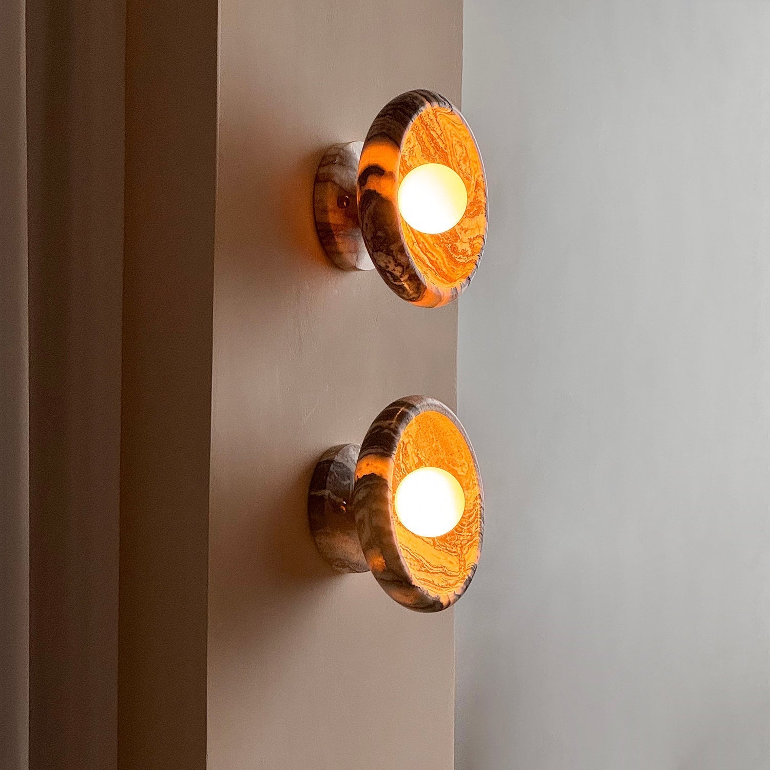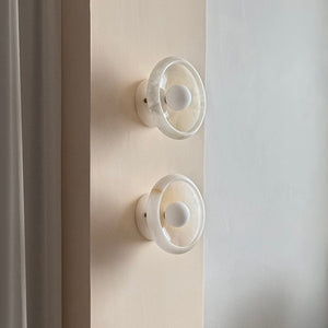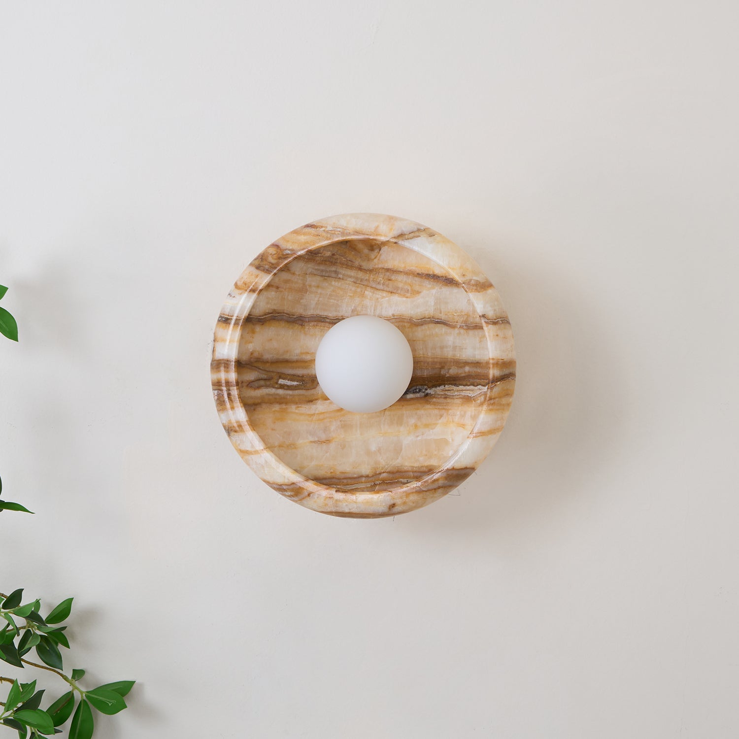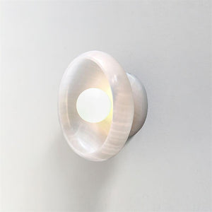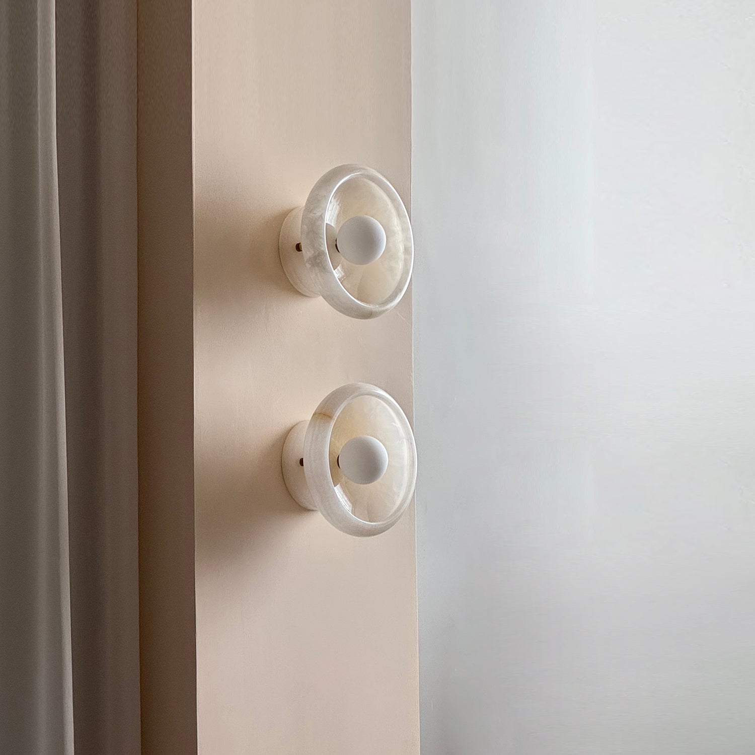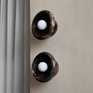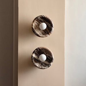 This wall light combines a refined marble body with glass detailing to deliver a clean, contemporary touch to spaces where moisture is a consideration. It is hardwired and damp-rated, making it suitable for bathrooms and covered outdoor areas.