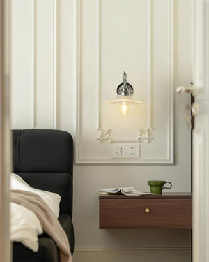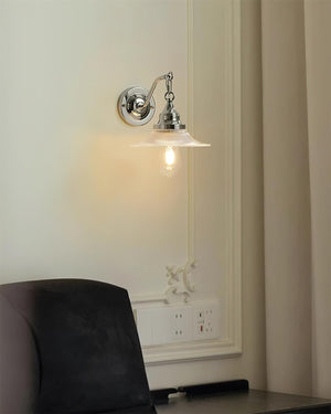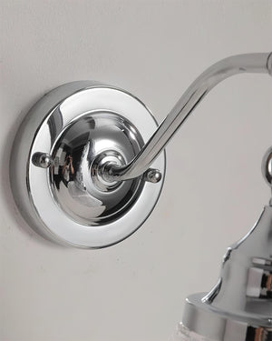 The light features a robust metal body finished in polished chrome, paired with a clear glass shade. This combination creates an uncluttered, modern silhouette that reflects light beautifully while maintaining a crisp, clean appearance on the wall.