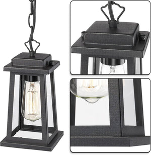 This outdoor pendant light features a classic lantern design with a durable black metal frame and clear glass panels, blending vintage charm with modern functionality. Its exposed bulb style creates a warm, welcoming glow, perfect for illuminating porches, patios, entryways, and outdoor dining spaces. Built with waterproof, weather-resistant materials and adjustable hanging chain, it ensures lasting performance and versatile installation for any exterior setting.